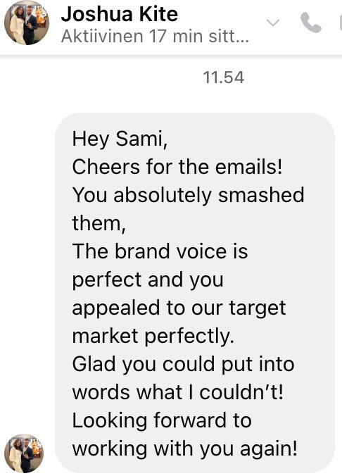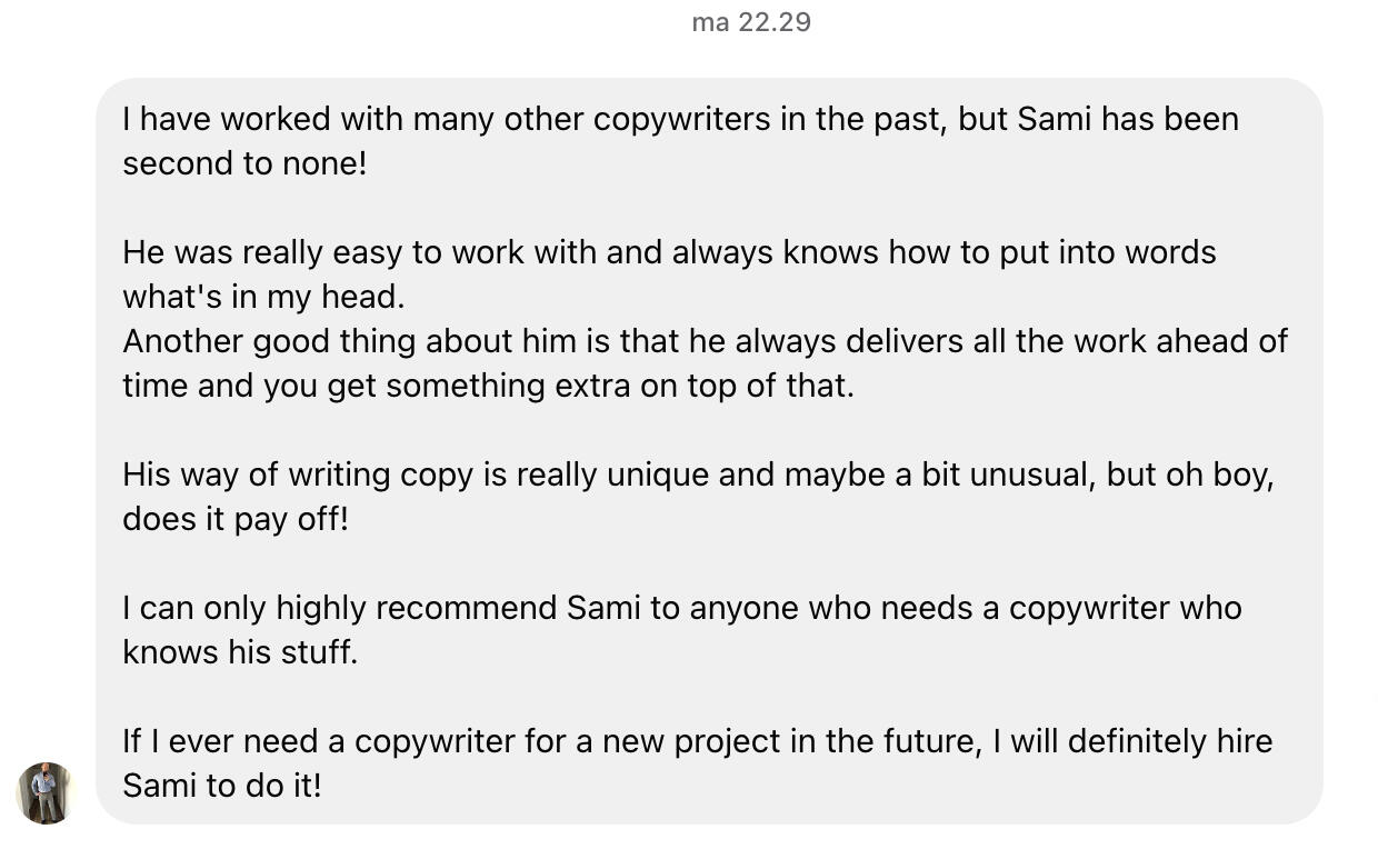 (Long journey in front of me, hah)Check out some of my testimonials and samples on here and if you’re ready,I’m looking to take on one more client this month who wants to add 20k/mo to their bottom line.Email me at:Sami@samilehtinen.com and let’s chat :)